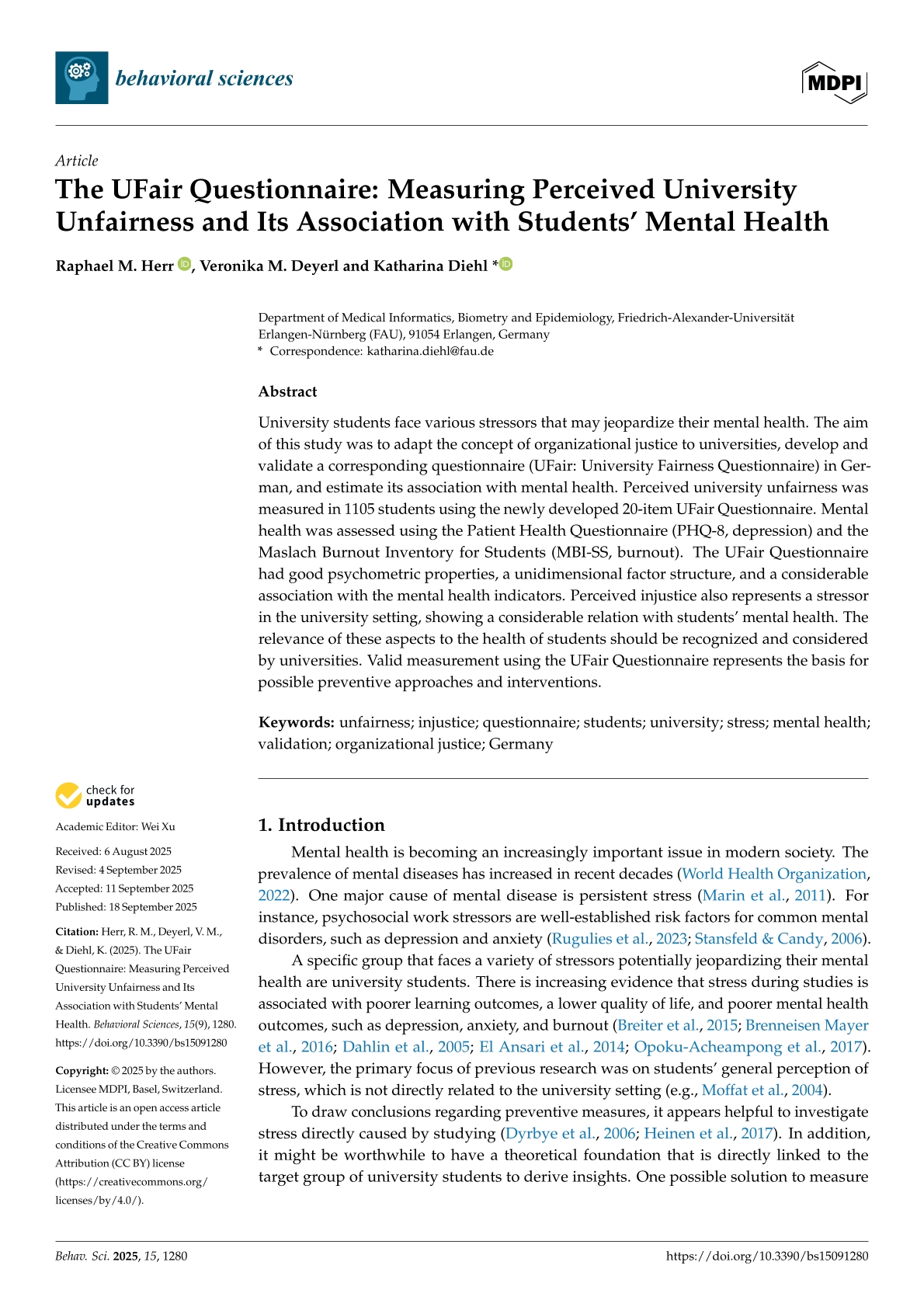 Im Rahmen des DFG-geförderten Projekts „Wahrgenommene universitäre Gerechtigkeit: Wie unfair behandelt fühlen sich Studierende und wie hoch ist das damit verbundene Gesundheitsrisiko?“ haben wir den University Fairness Questionnaire (UFair Questionnaire) entwickelt und validiert. Er ermöglicht eine systematische Erfassung der wahrgenommenen universitären Ungerechtigkeit von Studierenden im Hochschulkontext.
