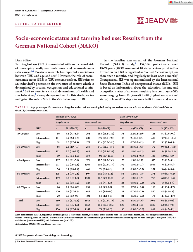 In unserer aktuellen Publikation haben wir mit den Daten der Nationalen Kohorte (NAKO) den Zusammenhang zwischen dem sozioökonomischen Status (SES) und der Nutzung von Solarien in Deutschland untersucht. Die Auswertungen zeigen, dass Personen mit niedrigem SES Solarien häufiger nutzen – sowohl regelmäßig als auch gelegentlich – als Personen mit hohem SES. Besonders ausgeprägt ist dieser Unterschied bei jüngeren und mittelalten Erwachsenen (d.h., zwischen 19 und 49 Jahren). Diese Ergebnisse verdeutlichen, dass die Nutzung von Solarien – vergleichbar mit anderen lebensstilbezogenen Risikoverhaltensweisen wie Tabakkonsum und Bewegungsmangel – sozial ungleich verteilt ist. Das deutet auf einen dringenden Handlungsbedarf hin.